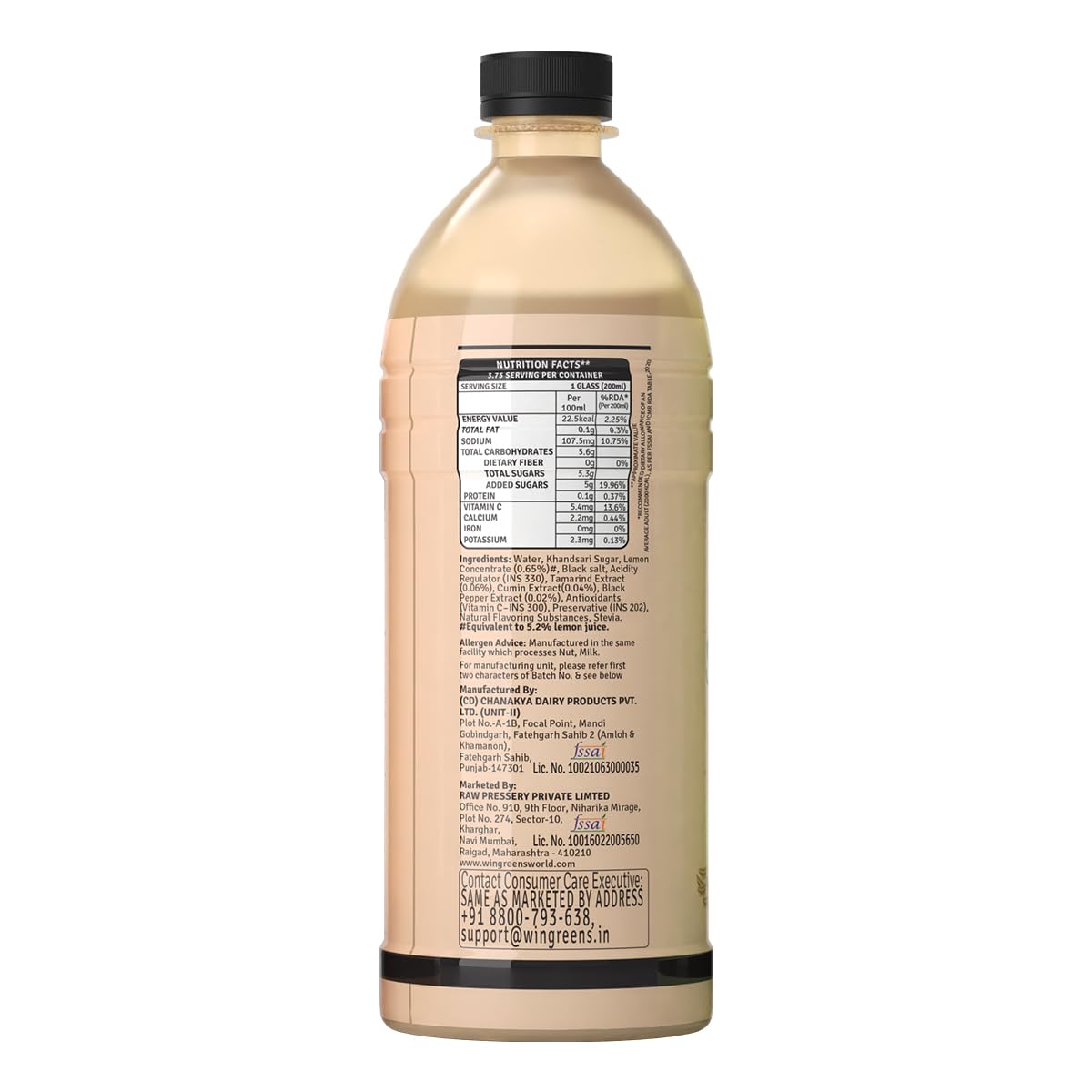 Ingredients: Water, Khandsari Sugar, Lemon Concentrate (0.65%), Black salt, Acidity Regulator (INS 330), Tamarind Extract (0.06%), Cumin Extract(0.04%), Black Pepper Extract (0.02%), Antioxidants (Vitamin C-INS 300), Preservative (INS 202), Natural Flavoring Substances, Stevia.